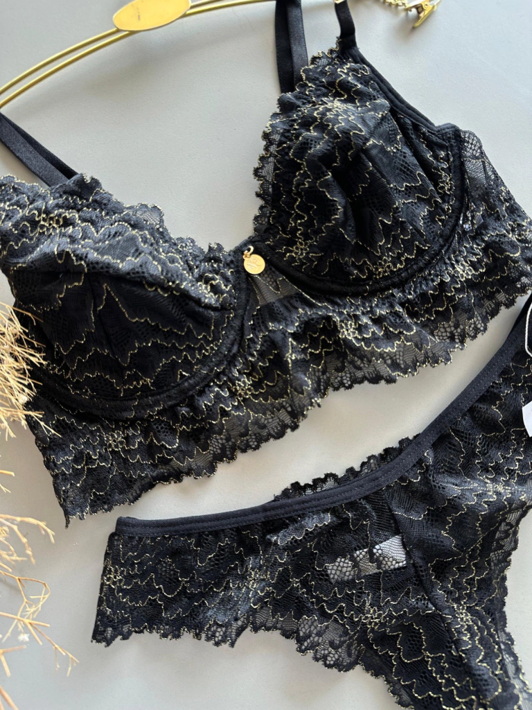 Renda com linhas douradas delicadas e reguladores banhados a ouro 24k deixam a peça com aquele brilho elegante que conquista corações.